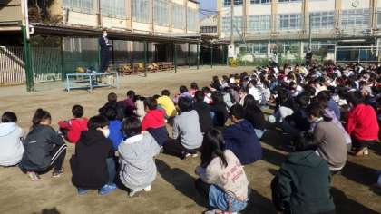 感染防止のため,11月の朝会も運動場で行いました。校長先生からは,夢を見つけて,夢に向かって努力することの大切さについてのお話がありました。