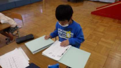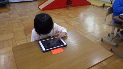 国語「おおきなかぶ」の学習で撮った動画をタブレットで確認したり,ワークシートを整理したりしています。