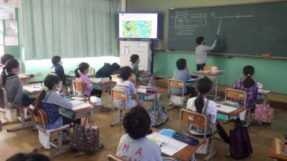 コンパスを使って,直線や折れ線の長さを写し取って比べる学習をしています。