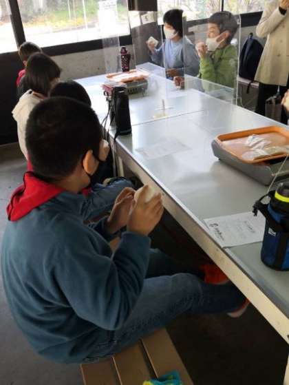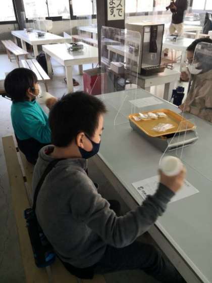 はじめに,バター作りの体験をしました。新鮮な淡路島牛乳をしっかりと振って,オリジナルバターを作っています。