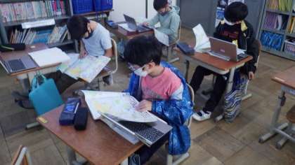 地図帳を使って,産地の場所を調べています。外国からの品物の,国名や国旗を調べています。