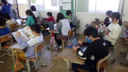 タブレットや本を使って,伝統工芸について調べています。