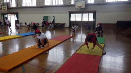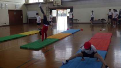 準備運動をした後に,前転や側転など,今できる技で連続技や組み合わせ技に挑戦しています。