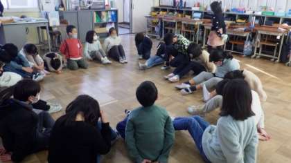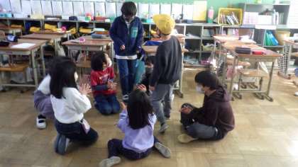 12月のたてわり遊びを行いました。教室や体育館,運動場で,グループごとに遊びました。「ハンカチ落とし」や「ドンじゃんけん」,大縄跳びなど,いろいろな遊びを楽しみました。