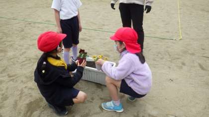 卒業式や入学式などでかざる花の苗を植えています。1年生が友達と協力して苗を植えていました。