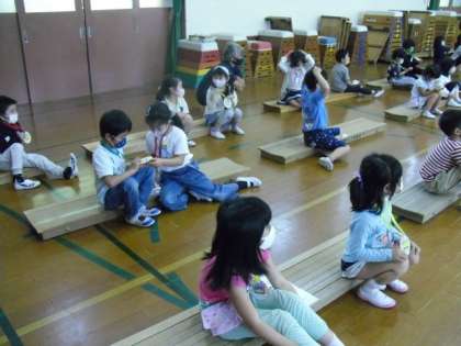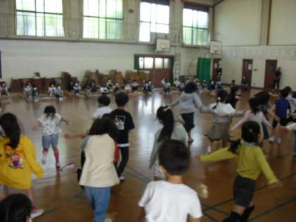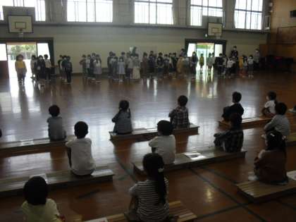 体育館で「1年生をむかえる会」を行いました。2年生以上の学年は,ダンスを披露したり簡単なゲームを一緒に楽しんだりして,それぞれに表現を工夫して1年生の入学をお祝いしました。お礼に1年生も元気いっぱい「さんぽ」を歌いました。