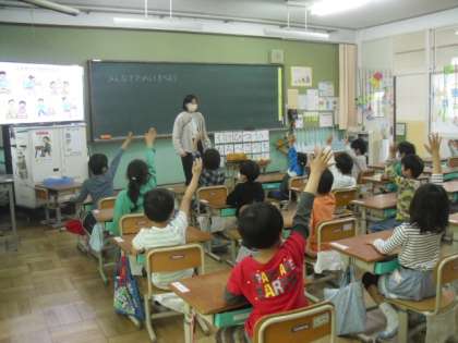 1年1組では,初めて栄養教諭の藤木先生と「食の学習」を行いました。