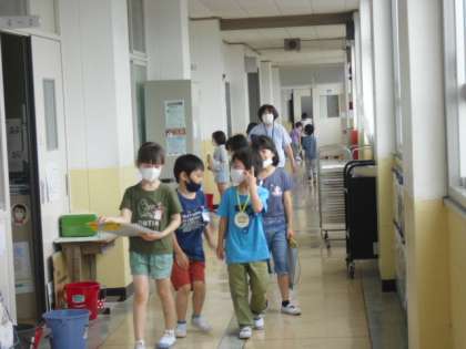 本日,1年生と一緒に学校探検をしました。1年生と2年生がペアになって,学校の様々な教室などを巡りました。校長先生をはじめ,各担任の先生,養護の先生,管理用務員さんなど普段は見ることが少ない部屋も見られて1年生にとっても楽しかったようです。