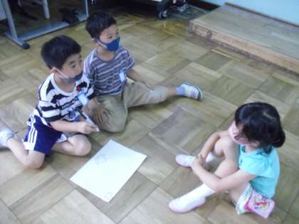 グループで協力して一つの絵を仕上げるゲーム「まねっこおえかき」も,グループのメンバーで協力して頑張りました!