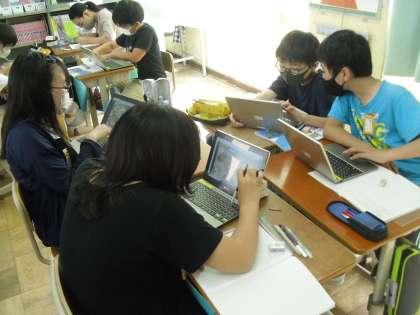 社会科では日本の歴史の学習を進めています。縄文時代と弥生時代について想像図を見比べながら,人々の生活の様子で気づいたことを班で交流しています。