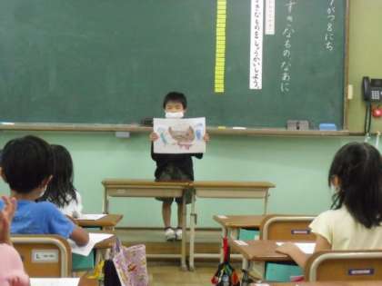 国語科「すきなもの,なあに」の学習で,自分の好きなものを発表しました。好きな理由や,好きになったエピソードなどを交えながら,堂々と発表することができました。