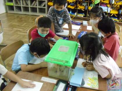 生活科「いきものとなかよし」の学習で,学校にいる生き物を探しに行きました。