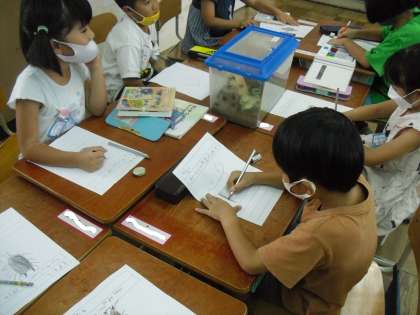 羽をこすって鳴いている様子も観察することができ,子どもたちは特徴をよくとらえながら観察カードを書いていました。