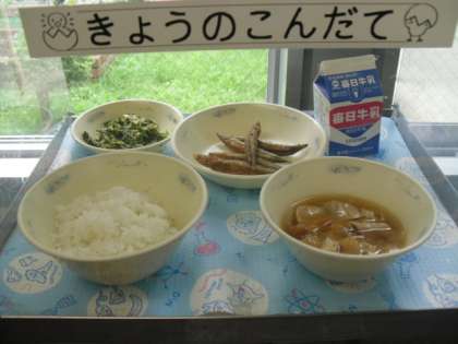 今日の献立「きびなごのこはくあげ」の“きびなご”は,ニシン科の魚で,体長は約10cmです。体は美しい銀色で,体の中央に色鮮やかな青色の帯模様があるのが特徴です。