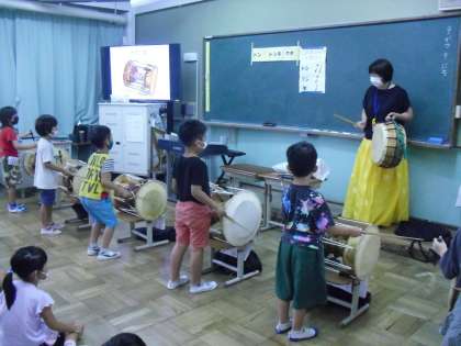 朝鮮半島の楽器「チャンゴ」にも挑戦しました。バチの持ち方やたたき方、リズムに気を付けながら、楽しく触れ合うことができました。