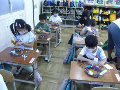 自分のあさがおから作った自分だけのリース。飾りつけをする表情も真剣です。