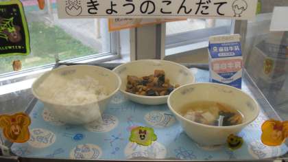 給食には,「地球にやさしい食事」がたくさん登場しています。例えば,今日の「肉みそいため」は,大豆やしいたけのもどし汁を使っています。食べ物をむだなく使う工夫をしている献立です。他にも,どの献立が地球にやさしい食事(献立)か考えてみるのもいいかもしれませんね。