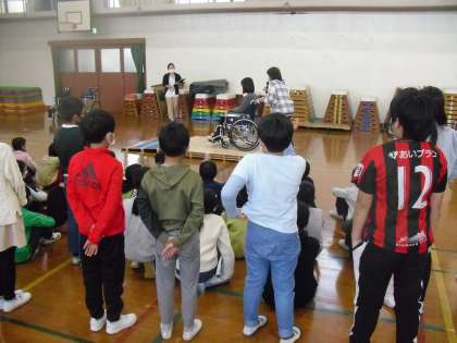 今日の学習は、北区社会福祉協議会と鳳徳ボランティアの皆様にお世話になって、車いすユーザーの方のお話を聞いたり、車いすの使い方を教えていただいたりしました。21日(月)には、新大宮商店街で車いす体験をします。