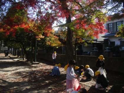 赤や黄色のきれいな落ち葉、大きな落ち葉、帽子つきのどんぐりなどを拾ったり、もみじの種をプロペラのように飛ばして遊んだりして、秋を楽しみました。
