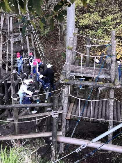 その後,「冒険の森」でアスレチックに挑戦しました。高い塔や高いつり橋がありますが,自分でクリアできそうか考え,グループのみんなと相談しながらトライしていきました。活動時間があっという間に過ぎてしまった,楽しい時間でした。