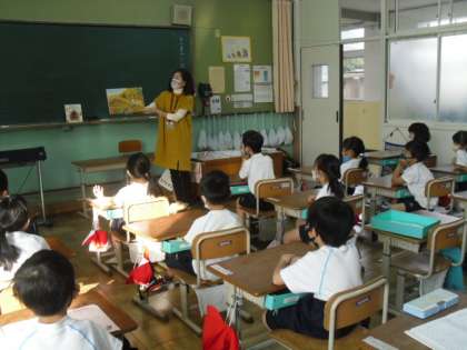 本日の図書ボランティアさんのよる読み聞かせは、1年生の教室で行われました。子どもたちは、すっかりお話しの世界に入り込んで聞いていました。
