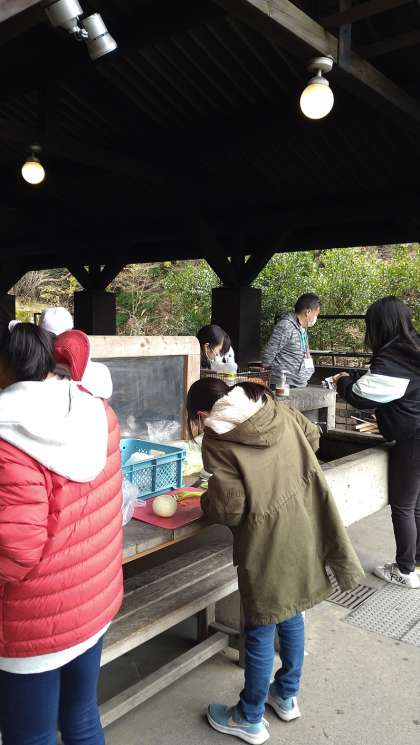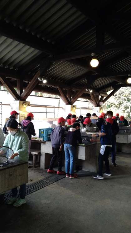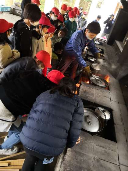 食材を切る係、かまどで火を燃やす係に分かれ、全員でがんばって作りました。苦労して作った分、おいしい昼食になりました。