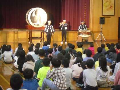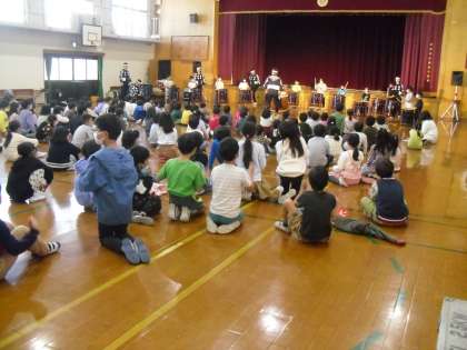 今日は、文化庁の「文化芸術による子供育成推進事業」として、太鼓芸能集団「鼓童」の公演を鑑賞しました。午前中は1〜3年生で、各クラスから2名、全部で12名の児童が太鼓体験をする時間もあり、大変盛り上がりました。見ているだけでも自然と体が動き、全身で音を楽しんでいる様子でした。