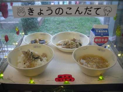 今日の「ぶたどん(白みそ味)」は新献立です。ぶた肉・たまねぎ・いろどりのよいにらを使ったどんぶりの具です。