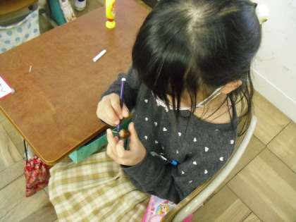 回りやすいように紙やすりで調整したり,回った時をイメージしてペンで色塗りをしたり,工夫をしてオリジナルのどんぐりゴマを作ることができました。