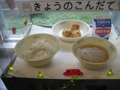 給食室で心をこめて、一つ一つ丸めて作りました。中はふんわりやわらかい、手作りの味を楽しんで食べました。