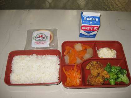 今日は、6年生が中学校給食体験をしました。小学校の給食の代わりに、中学校と同じ給食を小学校に運んでもらい、各教室で食べました。