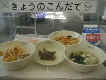 給食では、色あざやかな「ちらしずし」を食べていわいます。京都の丹後地方では、ちらしずしに「さばそぼろ」をのせて食べる習慣があり、今日の給食にも登場しました。