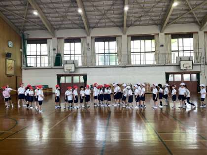 体育科の学習では、からだほぐし運動を行っています。学年みんなで「だるまさんがころんだ」や「ドンじゃんけん」をしました。楽しく活動することができました。