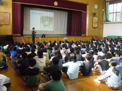 全校児童が体育館に集まって、朝会と児童集会を実施しました。これまでは、各教室からオンラインで参加する形で行っていましたので、とても新鮮でした。
