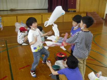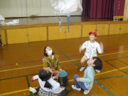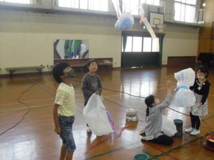 1日(月)に図画工作「ふきあがる風にのせて」の学習で、ポリ袋を使った作品を風にのせて遊びました。自分のつくった作品が広い体育館の中を飛んでいく様子を、子どもたちは楽しんでいました。自分や動物、キャラクターを描いて飛ばしたり、ビニールテープをなびかせたり、思い思いの作品が素敵でした。