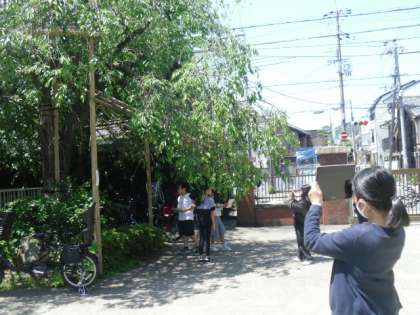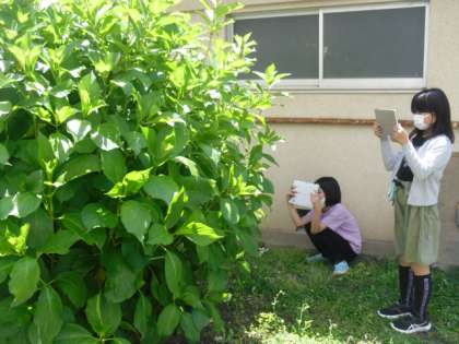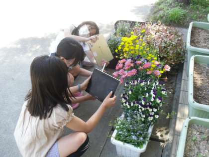 「春」の単元の学習で、子どもたちは生物のようすは季節によってどのように変わるのか考えました。そこで「春から冬までの1年間の生物のようすを見ないとわからない。」と気づき、自分たちが1年間観察する植物を学校内に探しに行きました。
