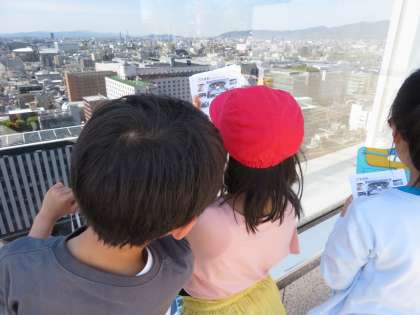 はじめに京都駅から市の様子を見ました。JRや新幹線、近鉄、市バスなどのさまざまな乗り物が京都駅に集まっていることと、街の様子を見てどんなものがあるかを確かめました。