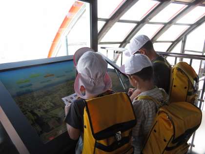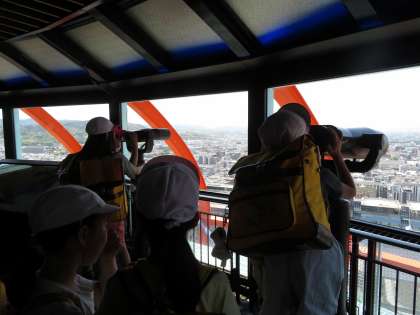 京都駅の次には京都タワーへ行きました。タワーの展望台からは京都市の様子が一望できます。望遠鏡を使ってどこにどんなものがあるかを探したり、観光パネルを見てどんなものが見えるかを確かめたりしている様子が見られました。