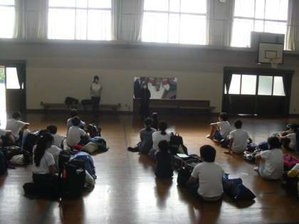 出発式では,児童が「みんなで協力しあい楽しめる修学旅行にしましょう。」「お互いのことをおもいやり、グループで協力しあいましょう。」とよびかけていました。