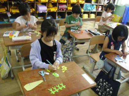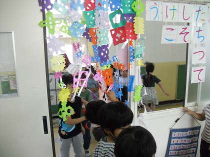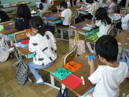図画工作科「ちょきちょきかざり」の学習で、折り紙をハサミで切って、飾りを作りました。