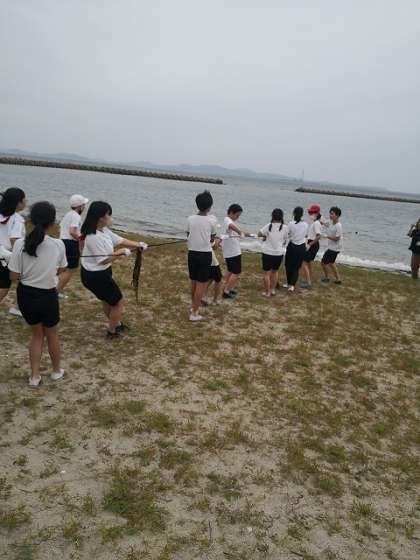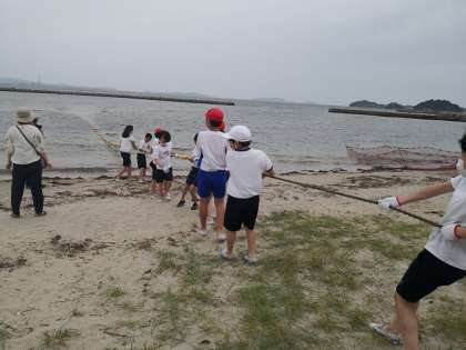 みんなでウォークラリーを頑張った後、浜で地引き網体験をしました。網の引き方を漁師さんに教わり、2グループに分かれて引きました。