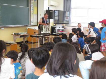 今日は地域の方に来ていただき、チョウや自然のお話をしてもらいました。チョウやガの種類や違いについてクイズをしたり、実際にアゲハチョウの幼虫を触ったりしました。地域の方が作っている標本も持ってきて見せていただき、「すごい!」と大興奮でした。