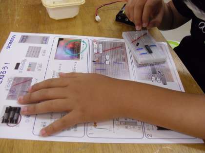 工房学習では、LEDを点滅させるしくみを作りました。細かい作業でしたが、一人一人が一生懸命に取り組んでいました。