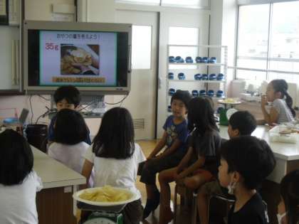 2時間にわたって学習し、前半1時間はスナック菓子など、お菓子の食べ方について学習しました。お菓子は「ごはんの2時間前食べること」や「200キロカロリー以下におさえること」などを教えていただいたり、「ポテトチップス うすしお味」を試食したりしました。