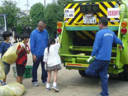 北区役所のエコまちステーションの皆様にお越しいただき、環境学習を実施しました。何故ごみを減らさなくてならないのかなど、具体的にお話を聞いた後、2台のパッカー車を使った体験学習をしました。大型ごみを一瞬で壊してしまう様子には、大人もびっくりしました。子どもたちは「カッコイイ!」と関心をもっていました。