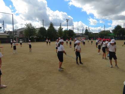 運動会に向けてなわとびを使ったダンスを練習しています。