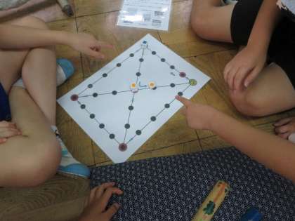 食べ物については「チヂミ」や「ビビンバ」など食べたことがあるけれど、韓国・朝鮮の食べ物と知らない子がたくさんいました。学習の最後にはみんなで韓国・朝鮮の「ユンノリ」という遊びをしました。少し複雑なルールで頭を使うので、とても盛り上がっていました。