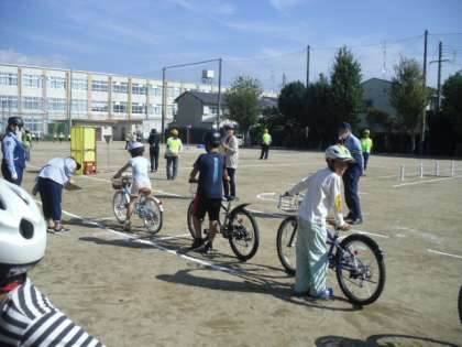 北警察署のお世話になり、4年生の自転車教室を実施しました。事前に、自転車の正しい乗り方を学習して、本日の実技に挑みました。地域の交通安全協会や交通安全推進委員の皆様、そして、保護者のボランティアもたくさん来ていただきました。暑い中、長時間ありがとうございました。これまでより安全に自転車に乗ることができると思います。