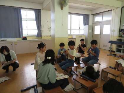今日は音楽室で音楽の授業をしました。パフはこれまでリコーダーだけで演奏していましたが、今日からピアノやすず、カスタネットなどの楽器も入れて合奏をしました。みんなの音を聴いて演奏するのはとても難しいけれど、「合奏するとこうなるんだな」というイメージがもてたようです。