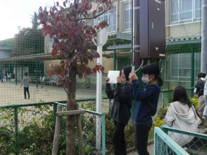 4年生は「秋」の単元の学習で、タブレットを使って校内の秋を見つけに回りました。